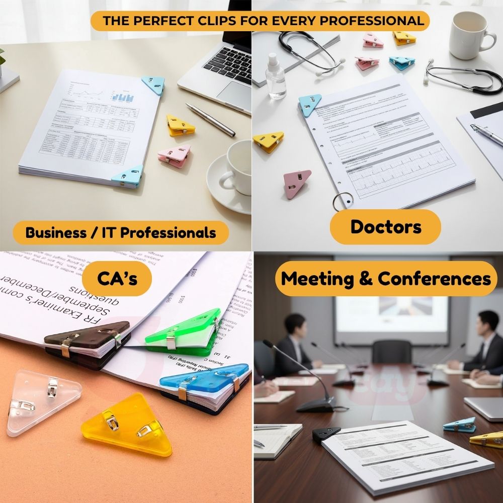 Organizing loose papers, bookmarking books, or marking documents just got easier — and more vibrant. The OrgaClip™ Office Edge Clip Organizer is a set of 5 precision-cut, triangle corner clips that slide onto the corners of pages or sheets, securing them without tearing or adhesive.